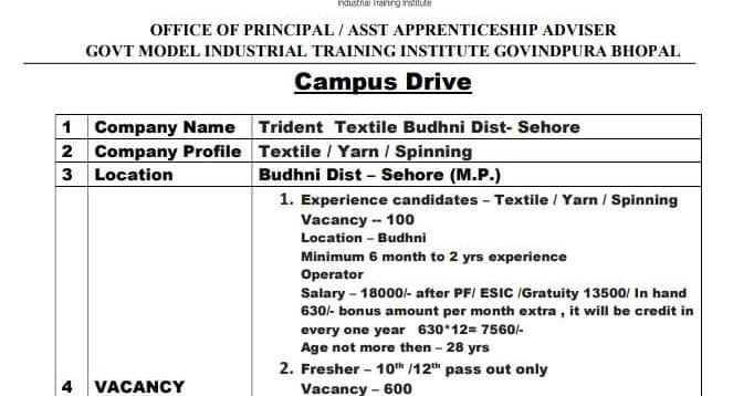 Iti 10th 12th Pass Permanent Job Campus Placement In Govt Iti Bhopal M P For Company Trident Textile Budhni Iti And Diploma Jobs - Der einfachste weg nach govindpura ist das einsteigen in einen der privaten busse, die in bhopal fahren.