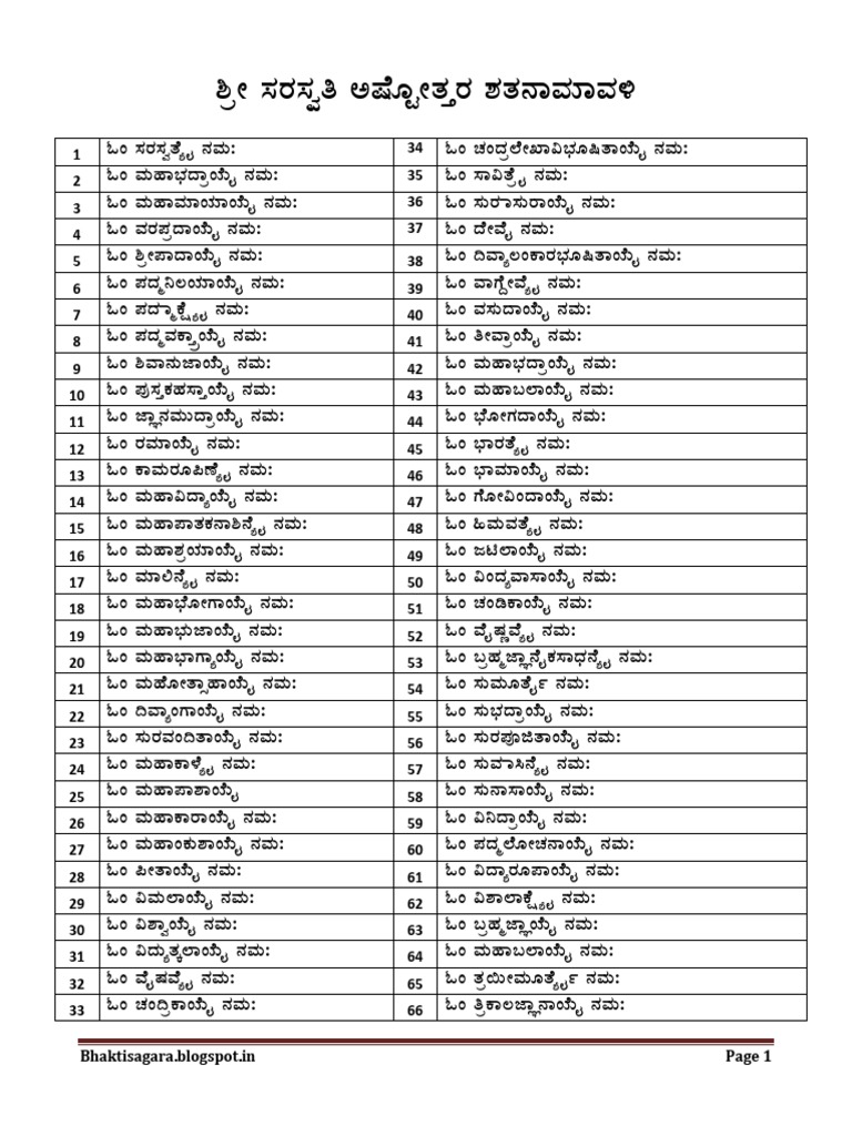 Saraswati Stotram In Kannada - 108 names of goddess saraswati, shri sarasvati ashtottara shatanamavali.